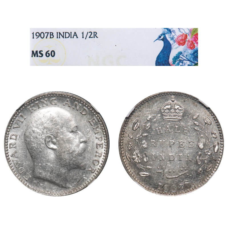 Edward VII, Silver, Half Rupee, 1907, Bombay Mint, 'B' incused & dot. F. Prid 316. GK 965. NGC Slabbed MS 60. Rare.