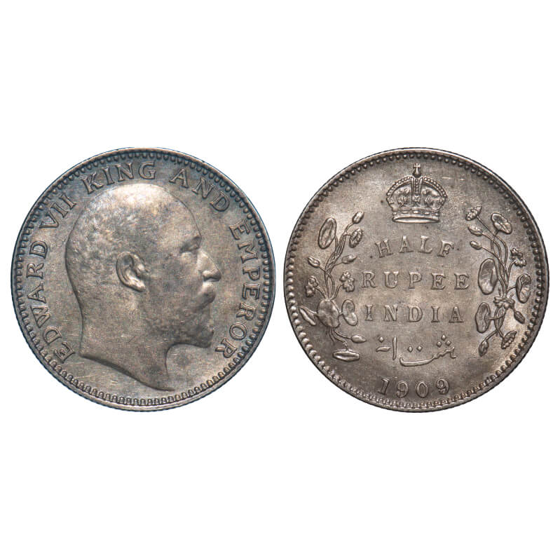 Edward VII, Silver, Half Rupee, 1909, Calcutta Mint, No mint mark. F. Prid 313. GK 969. About Uncirculated. Rare.