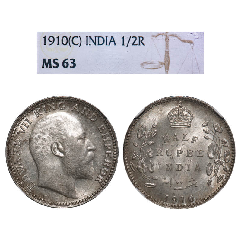 Edward VII, Silver, Half Rupee, 1910, Calcutta Mint, No mint mark. F. Prid 314. GK 971. NGC Slabbed MS 63. Extremely Rare.