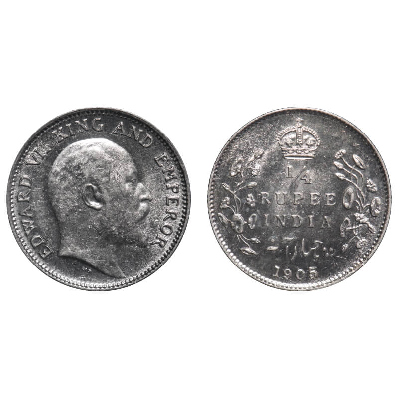 Edward VII, Silver, 1/4 Rupee, 1905, Calcutta Mint, No mint mark, Ghost on Rev. F. Prid 434. GK 974. Mint State. Very Rare.