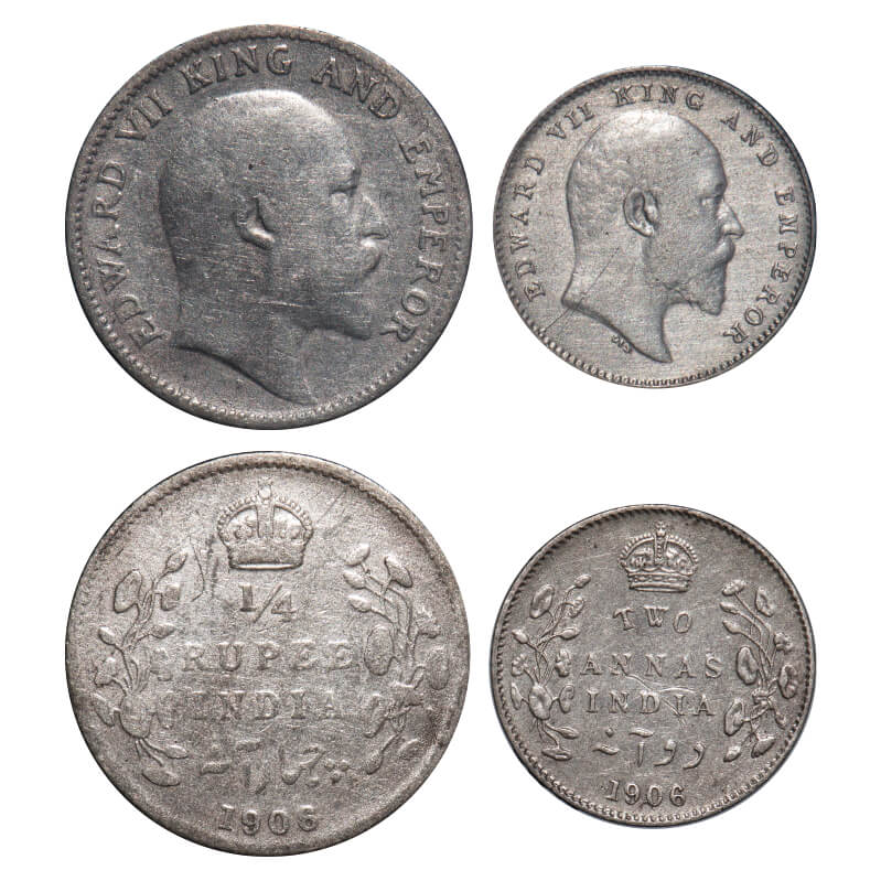 | Edward VII, Silver, 1/4 Rupee, 2 Annas, (2 coins), 1906, Calcutta Mint, No mint mark. F. Prid 435, 559. GK 975, 983. Very Fine+ to Extremely Fine+. Very Scarce. |