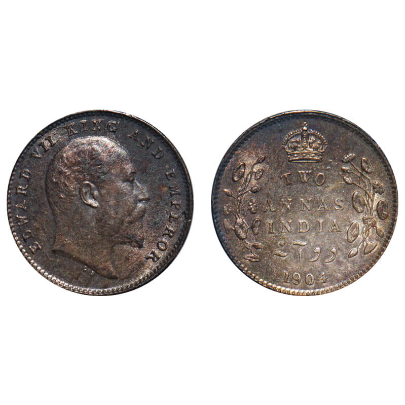 | Edward VII, Silver, 2 Annas, 1904, Calcutta Mint, No mint mark, Ghost on Rev, Planchet flaw on Obv. F. Prid 557. GK 981. Uncirculated, Toned. Rare. |