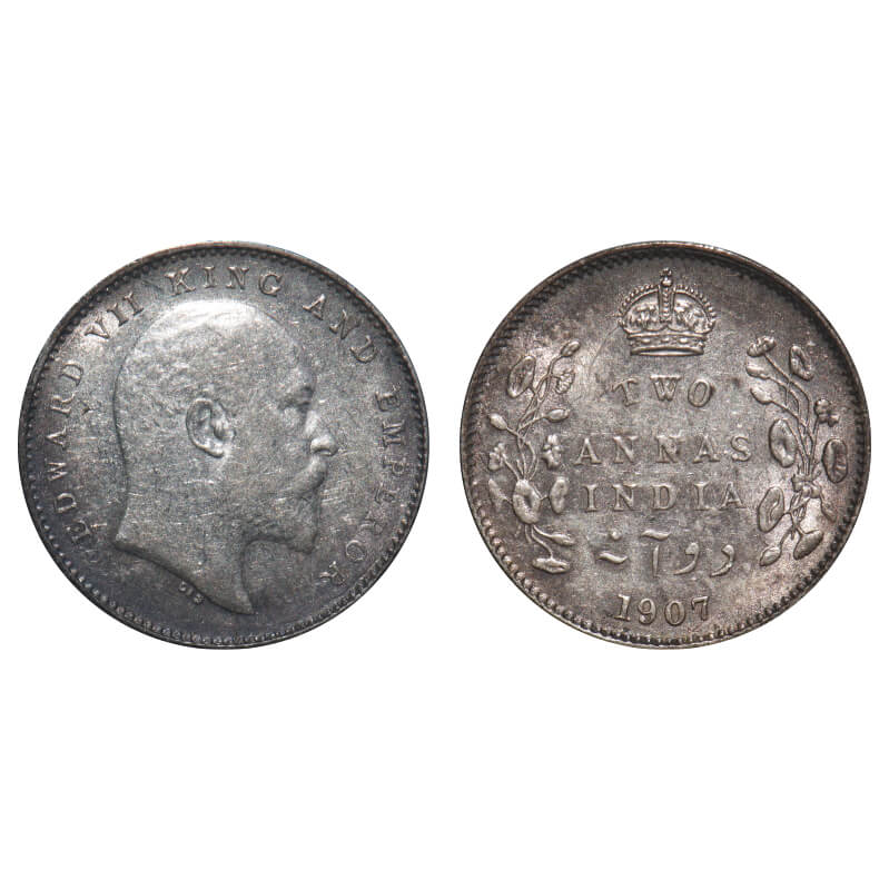 Edward VII, Silver, 2 Annas, 1907, Calcutta Mint, No mint mark, Ghost on Rev. F. Prid 560. GK 984. Extremely Fine+. Very Scarce.