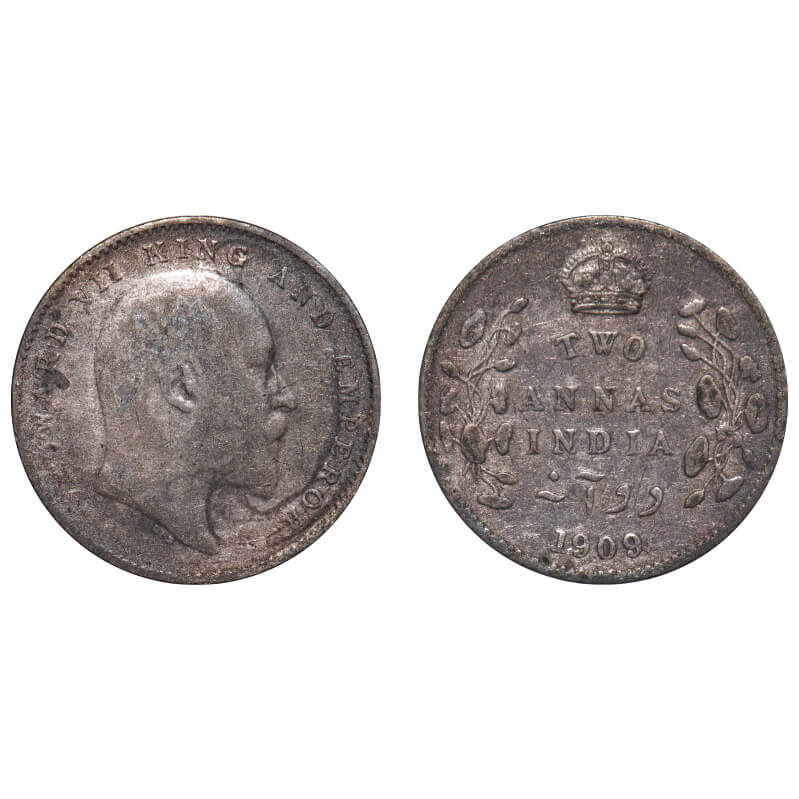 Edward VII, Silver, 2 Annas, 1909, Calcutta Mint, No mint mark. F. Prid 562. GK 986. Very Fine+ Toned. Very Rare.