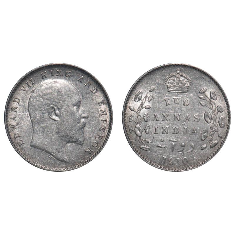 Edward VII, Silver, 2 Annas, 1910, Calcutta Mint, No mint mark. F. Prid 563. GK 987. Extremely Fine. Very Scarce.