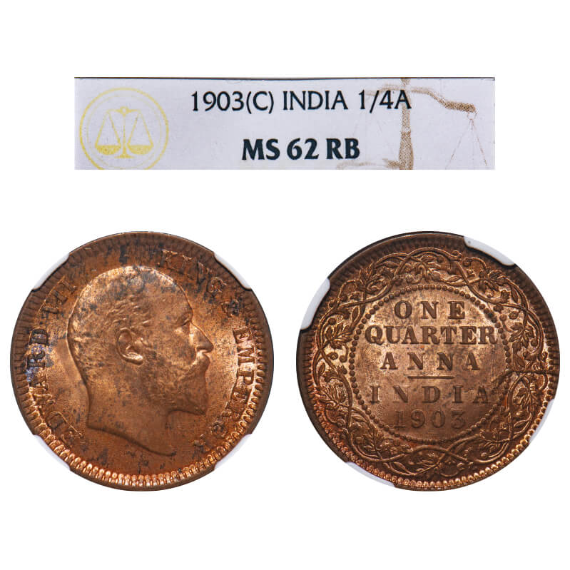 Edward VII, Copper, Quarter Anna, 1903, Calcutta Mint, No mint mark. F. Prid 646. GK 994. NGC Slabbed MS 62 RB. Very Rare