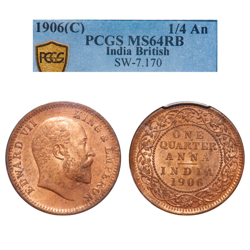 Edward VII, Copper, Quarter Anna, 1906, 6.47gm, Calcutta Mint, No mint mark. F. Prid 650. GK 997. PCGS Slabbed MS 64 RB. Extremely Rare