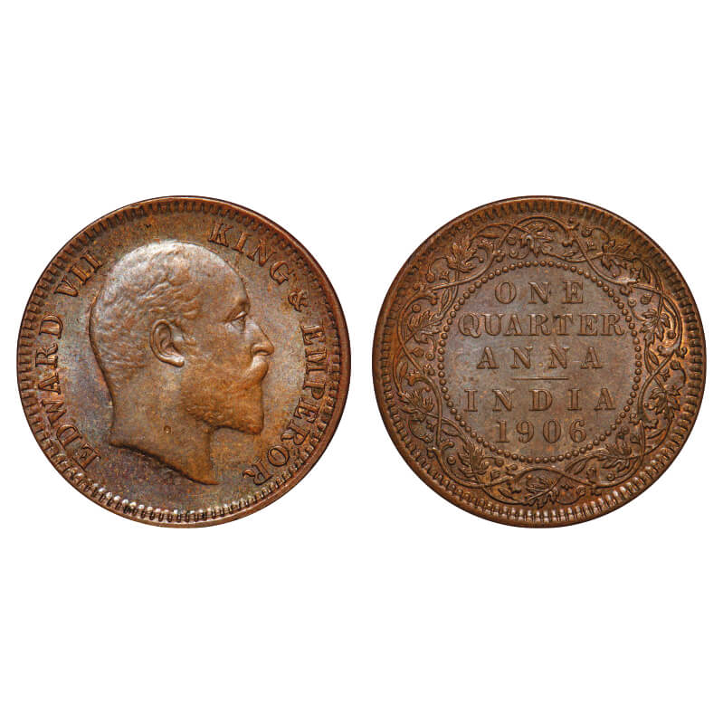 Edward VII, Bronze, Quarter Anna, 1906, 4.78gm, Calcutta Mint, No mint mark, Ghost on Rev. F. Prid 651. GK 998. Uncirculated. Rare.