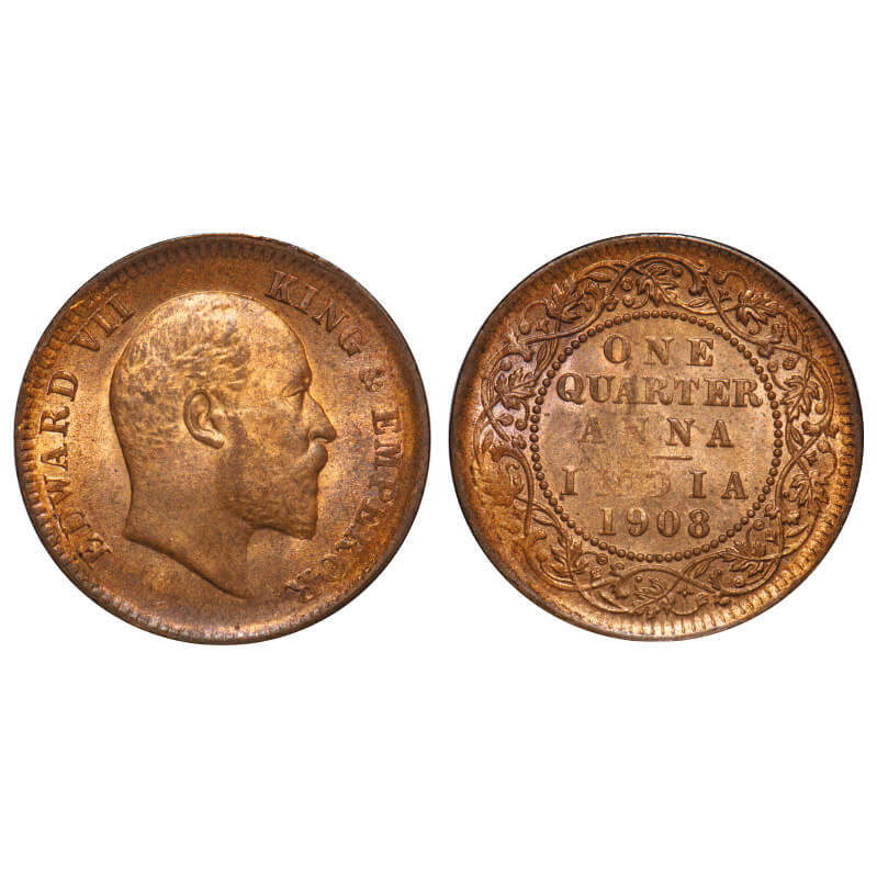 Edward VII, Bronze, Quarter Anna, 1908, Calcutta Mint, No mint mark. F. Prid 653. GK 1000. Uncirculated. Rare