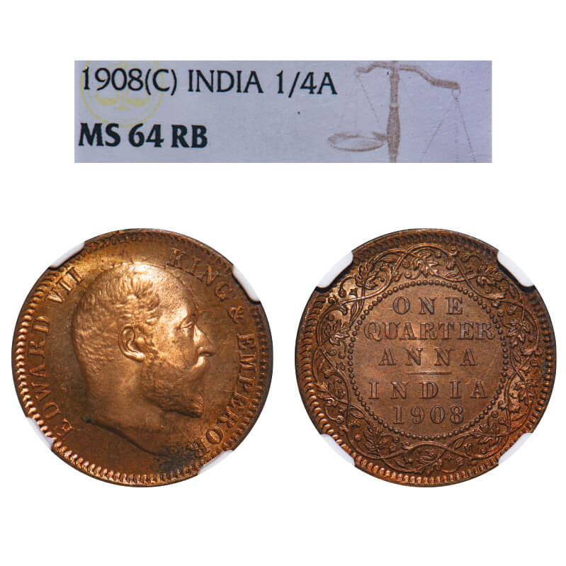 Edward VII, Bronze, Quarter Anna, 1908, Calcutta Mint, No mint mark. F. Prid 653. GK 1000. NGC Slabbed MS 64 RB. Extremely Rare