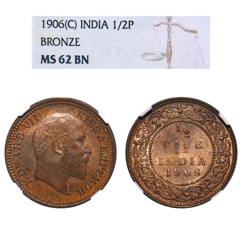 Edward VII, Bronze, 1/2 Pice, 1906, 2.43gm, Calcutta Mint, No mint mark. F. Prid 740. GK 1007. NGC Slabbed MS 62 BN. Exceedingly Rare.