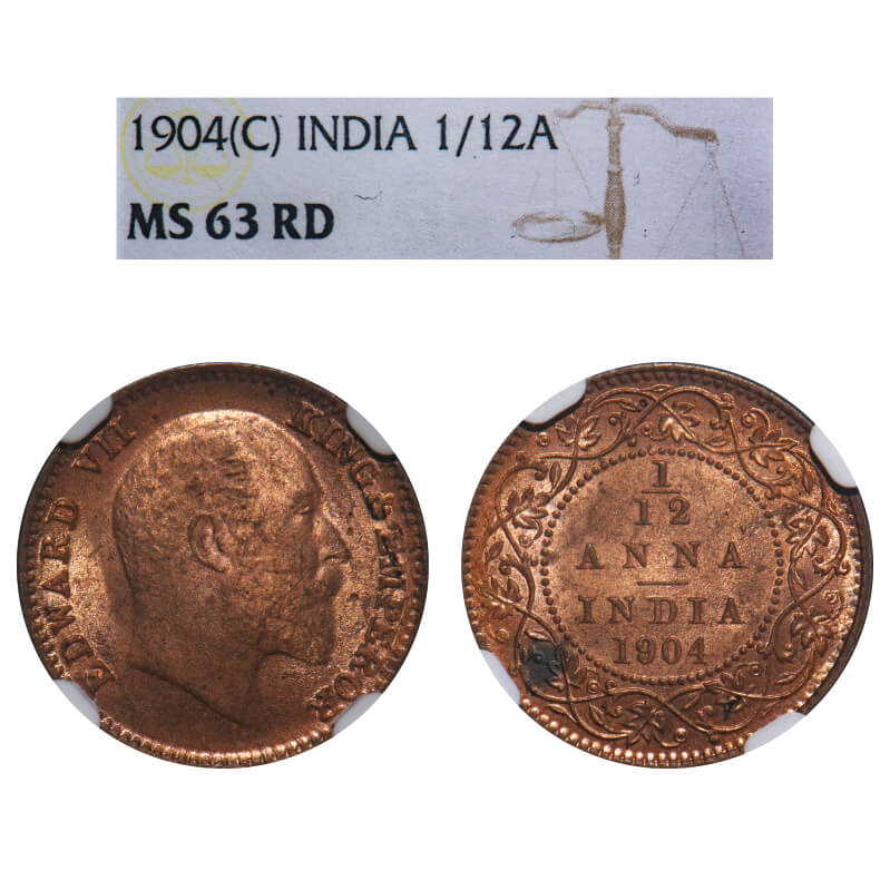 Edward VII, Copper, 1/12 Anna, 1904, Calcutta Mint, No mint mark. F. Prid 819. GK 1013. NGC Slabbed MS 63 RD. Extremely Rare.
