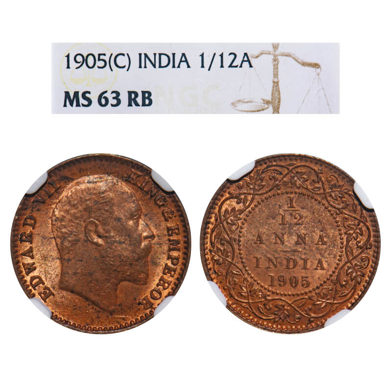 Edward VII, Copper, 1/12 Anna, 1905, Calcutta Mint, No mint mark. F. Prid 820. GK 1014. NGC Slabbed MS 63 RB. Very Rare.