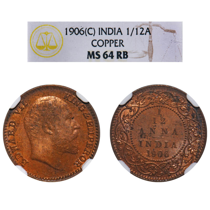 Edward VII, Copper, 1/12 Anna, 1906, 2.16gm, Calcutta Mint, No mint mark. F. Prid 821. GK 1015. NGC Slabbed MS 64 RB. Extremely Rare.