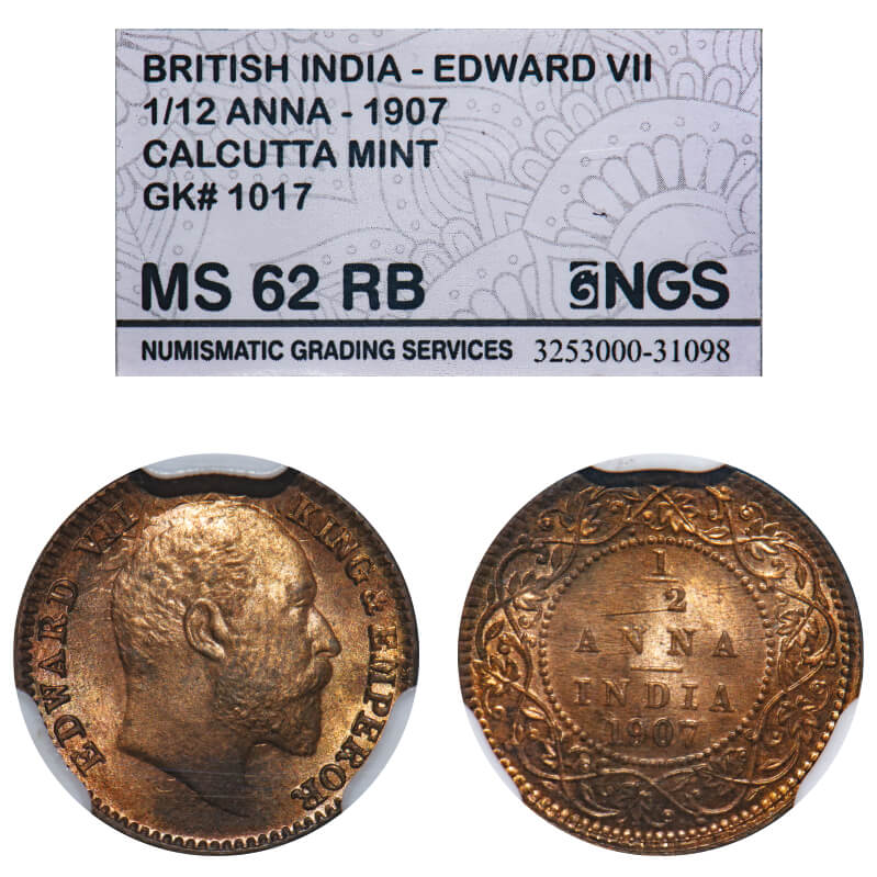 Edward VII, Bronze, 1/12 Anna, 1907, Calcutta Mint, No mint mark. F. Prid 823. GK 1017. NGS Slabbed MS 62 RB. Rare.