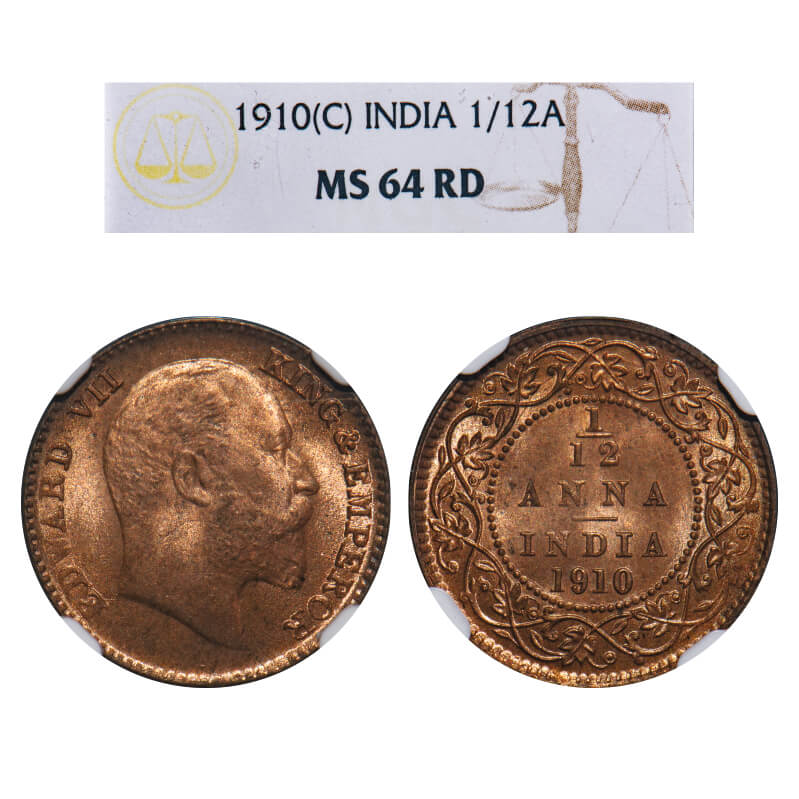 Edward VII, Bronze, 1/12 Anna, 1910, Calcutta Mint, No mint mark. F. Prid 826. GK 1020. NGC Slabbed MS 64 RD. Extremely Rare.
