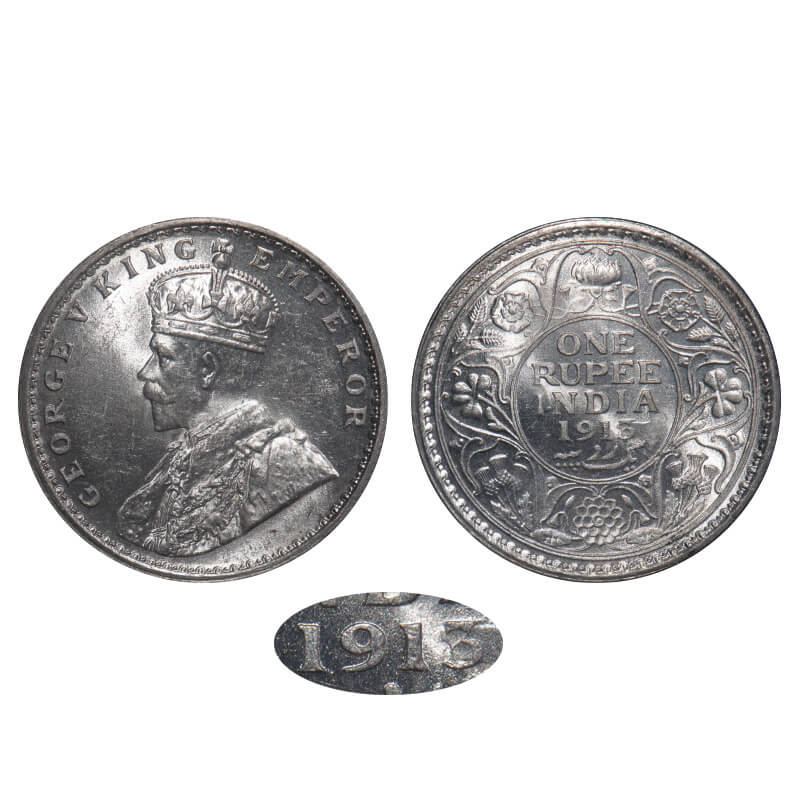 George V, Silver, Rupee, 1913, Calcutta Mint, No dot, Elephant, Sunken ghost like impression with very prominent mirrored design of numeral 3 in year date 1913 which looks very thin on Rev this is also because of the die clash. F. Prid 209. GK 1027. Mint State. Rare.