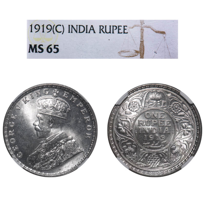 George V, Silver, Rupee, 1919, Calcutta Mint, No dot, Elephant. F. Prid 215. GK 1039. NGC Slabbed MS 65. Extremely Rare.
