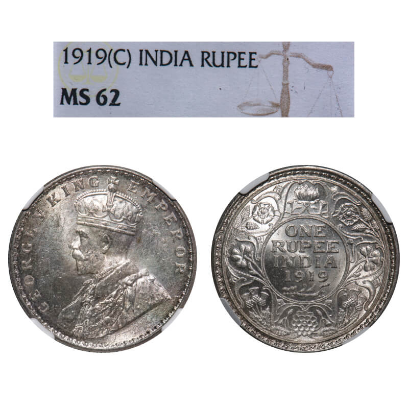George V, Silver, Rupee, 1919, (2 slabs), 1) Calcutta Mint, No dot, Elephant, 2) Bombay Mint, Dot, ...
