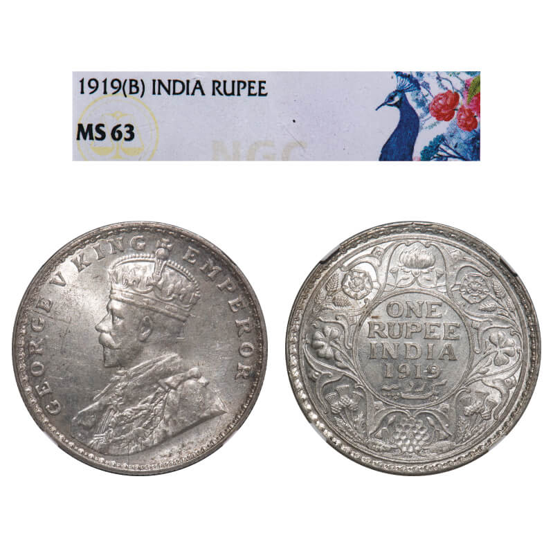 George V, Silver, Rupee, 1919, Bombay Mint, Dot, Elephant. F. Prid 225. GK 1040. NGC Slabbed MS 63. Very Rare.