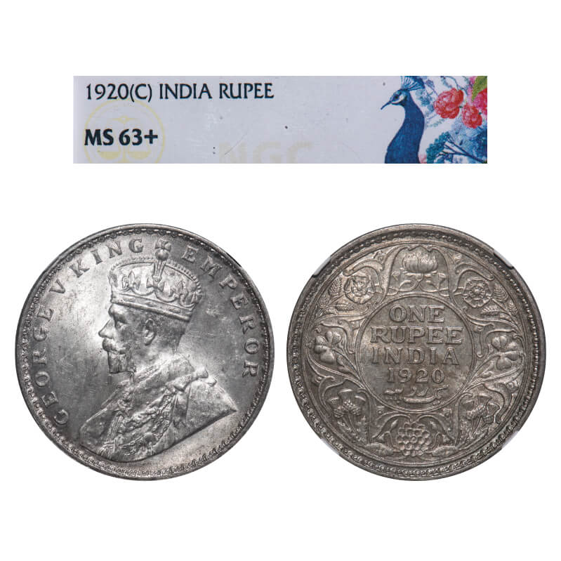 George V, Silver, Rupee, 1920, Calcutta Mint, No dot, Elephant. F. Prid 216. GK 1041. NGC Slabbed MS 63+. Extremely Rare.