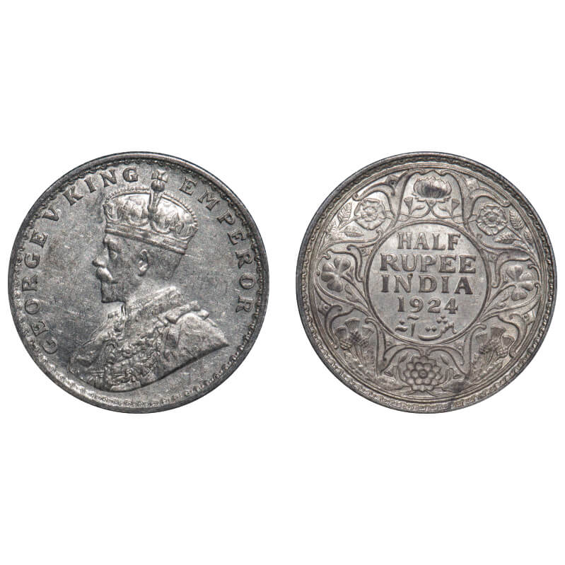 George V, Silver, Half Rupee, 1924, Bombay Mint, Dot, Elephant, Instead of dot as a mint mark there...