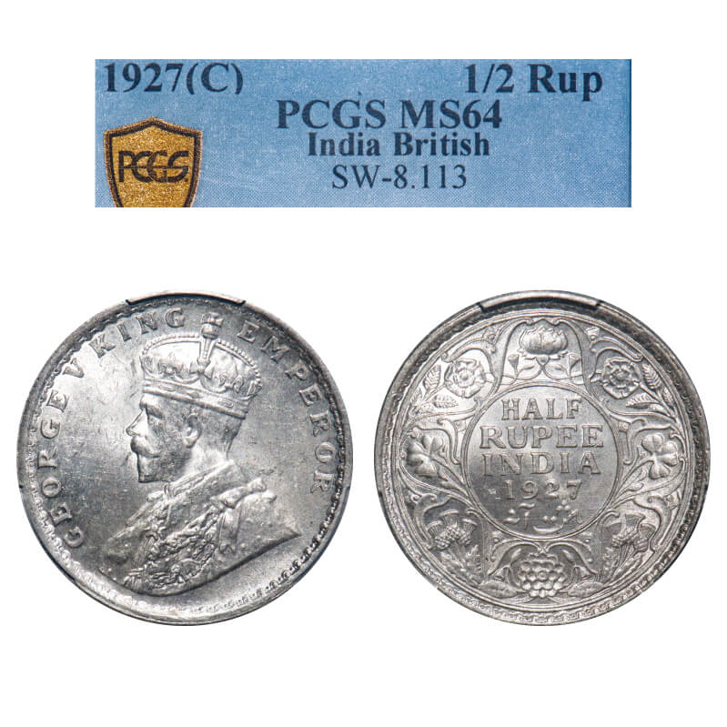 George V, Silver, Half Rupee, 1927, Calcutta Mint, No dot, Elephant, Single Mint coin. F. Prid 330. GK 1069. PCGS Slabbed MS 64. Extremely Rare.
