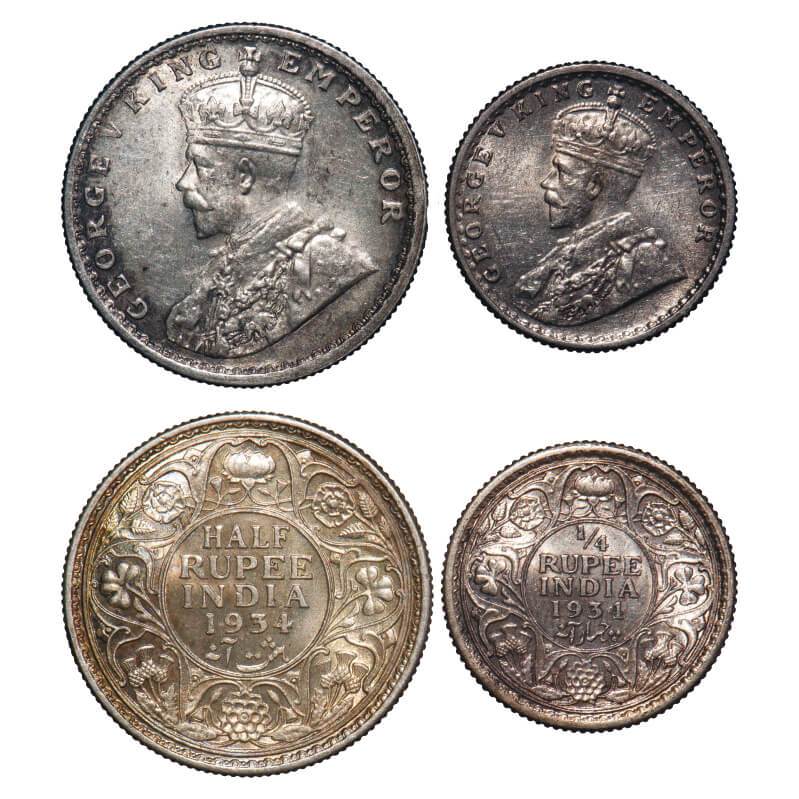 | George V, Silver, Half Rupee, 1/4 Rupee, (2 coins), 1934, Calcutta Mint, No dot. F. Prid 334, 452. GK 1074, 1098, F. Prid 334, 452. Uncirculated. Scarce. |