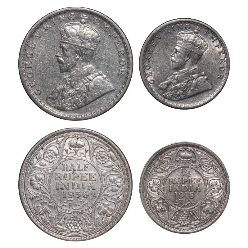 | George V, Silver, (2 coins), 1) Half Rupee, 1936, Calcutta mint, No dot, Elephant, 2) 1/4 Rupee, 1918, Calcutta Mint, No dot, Elephant. F. Prid 335, 447. GK 1075, 1091. About Uncirculated to Almost Uncirculated. Very Scarce. |