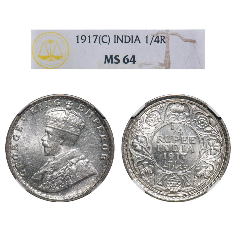 George V, Silver, 1/4 Rupee, 1917, Calcutta Mint, No dot, Elephant. F. Prid 446. GK 1090. NGC Slabbed MS 64. Extremely Rare.
