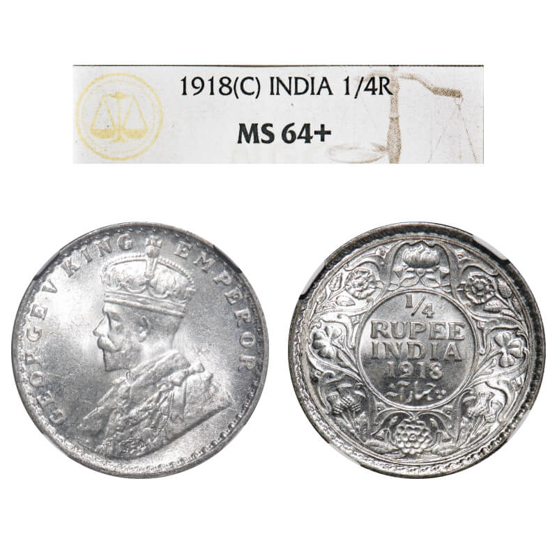 George V, Silver, 1/4 Rupee, 1918, Calcutta Mint, No dot, Elephant. F. Prid 447. GK 1091. NGC Slabbed MS 64+. Extremely Rare.