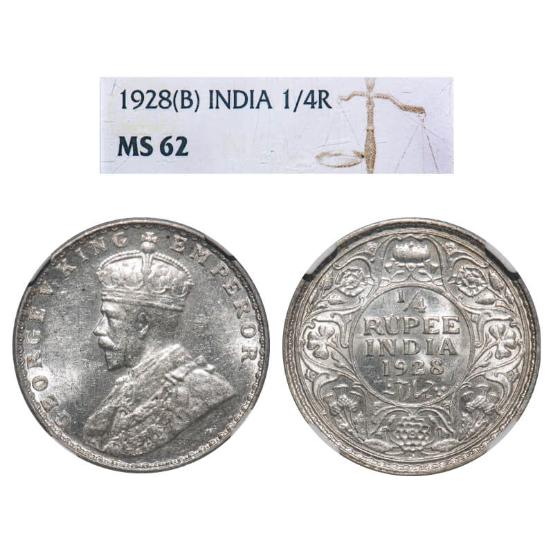 George V, Silver, 1/4 Rupee, 1928, Bombay Mint, Dot, Elephant. F. Prid 459. GK 1095. NGC Slbbed MS 62. Rare.