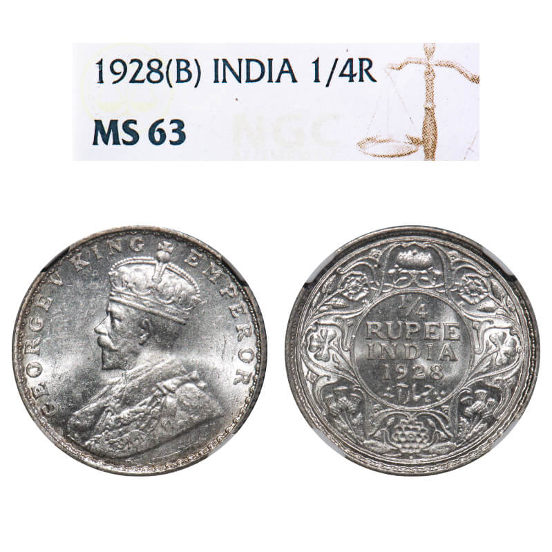 George V, Silver, 1/4 Rupee, 1928, Bombay Mint, Dot, Elephant. F. Prid 459. GK 1095. NGC Slabbed MS 63. Very Rare.