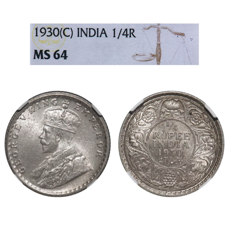 George V, Silver, 1/4 Rupee, 1930, Calcutta Mint, No dot, Elephant. F. Prid 451. GK 1097. NGC Slabbed MS 64. Very Rare.