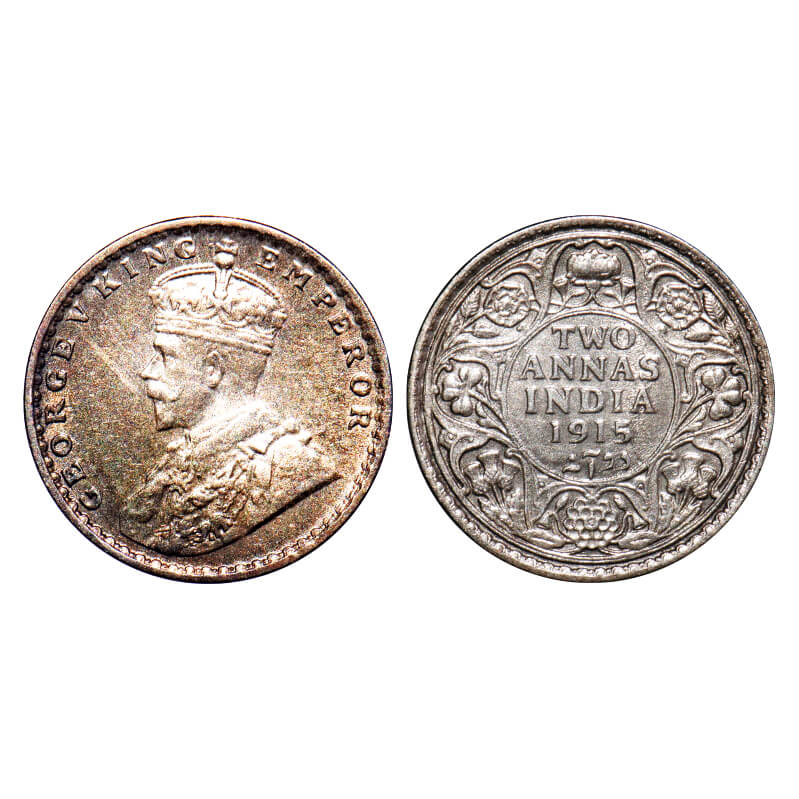 George V, Silver, 2 Annas, 1915, Calcutta Mint, No dot, Elephant. F. Prid 568. GK 1114. Extremely Fine+. Very Scarce.