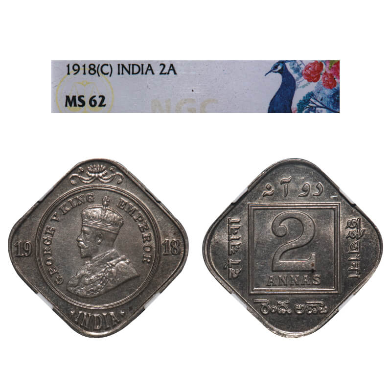 George V, Copper-Nickel, 2 Annas, 1918, Calcutta Mint, No dot. F. Prid 880. GK 1118. NGC Slabbed MS 62. Very Rare.