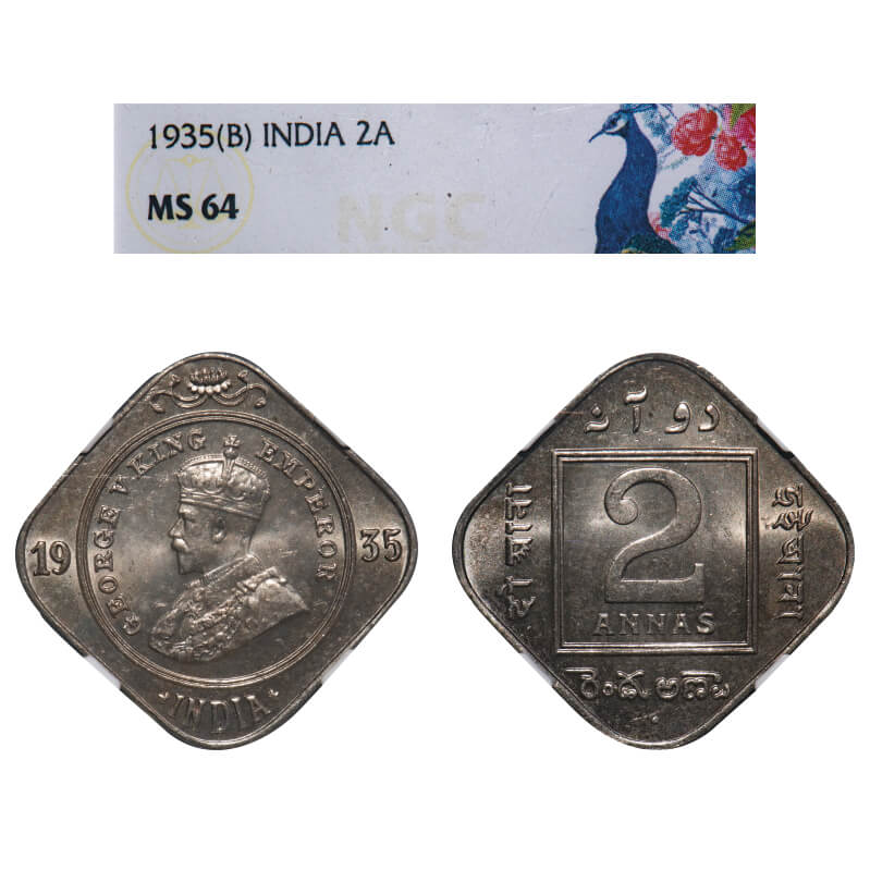 George V, Copper-Nickel, 2 Annas, 1935, Bombay Mint, Dot. F. Prid 902. GK 1139. NGC Slabbed MS 64. Extremely Rare.