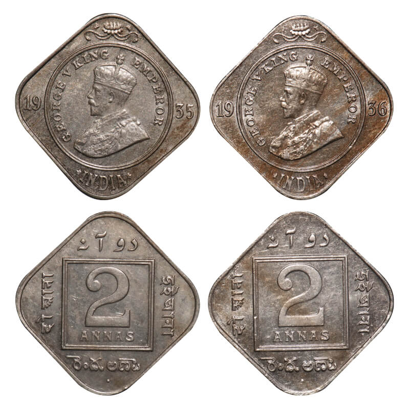 | George V, Copper-Nickel, 2 Annas, (2 coins), 1935, 1936, Bombay Mint, Dot. F. Prid 902, 903. GK 1139, 1140. About Uncirculated to Almost Uncirculated. Very Scarce. |