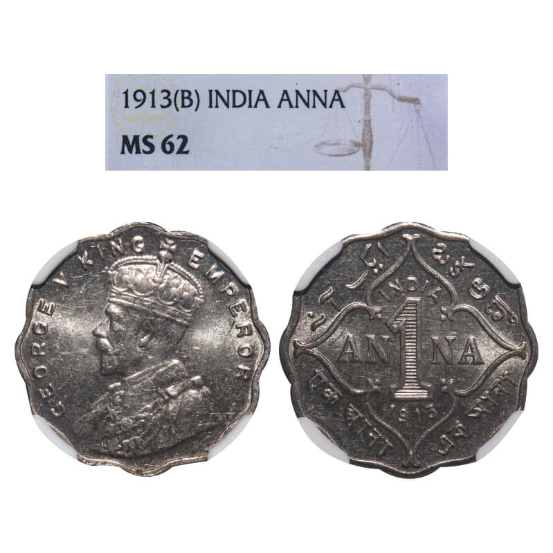 George V, Copper-Nickel, 1 Anna, 1913, Bombay Mint, No dot. F. Prid 943. GK 1143. NGC Slabbed MS 62. Very Rare.