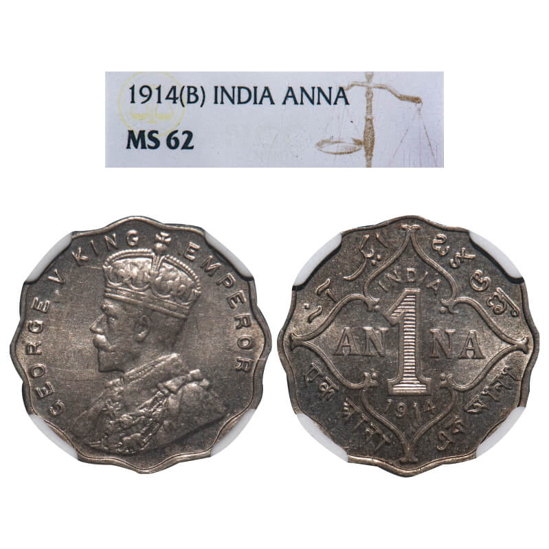 George V, Copper-Nickel, 1 Anna, 1914, Bombay Mint, No dot. F. Prid 944. GK 1144. NGC Slabbed MS 62. Very Rare.