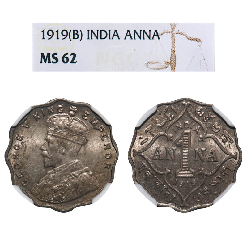 George V, Copper-Nickel, 1 Anna, 1919, Bombay Mint, No dot. F. Prid 949. GK 1149. NGC Slabbed MS 62. Rare.