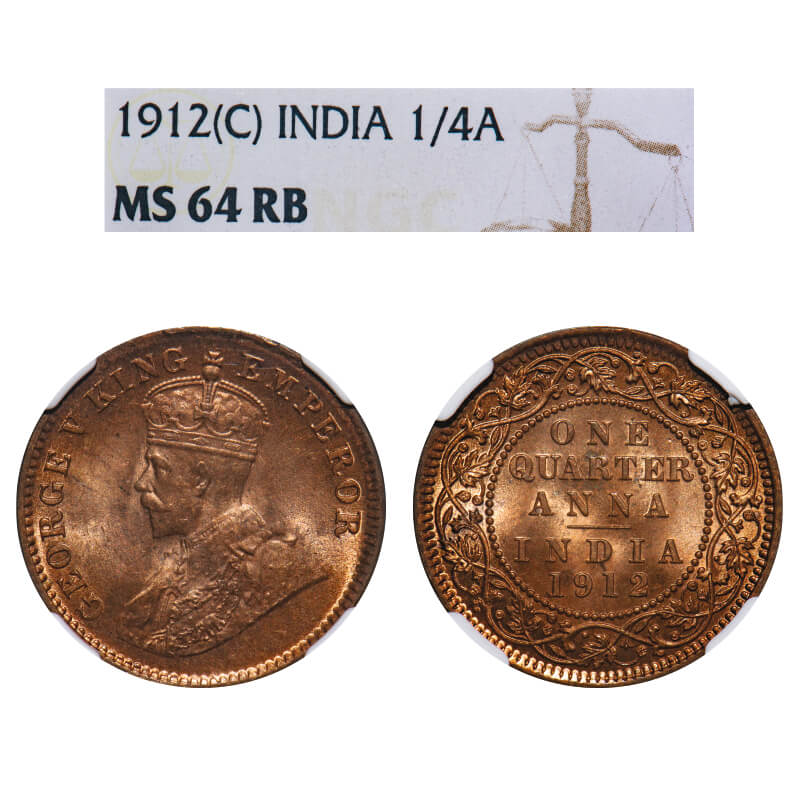 George V, Bronze, Quarter Anna, 1912, Calcutta Mint, No dot, Elephant. F. Prid 658. GK 1172. NGC Slabbed MS 64 RB. Extremely Rare.