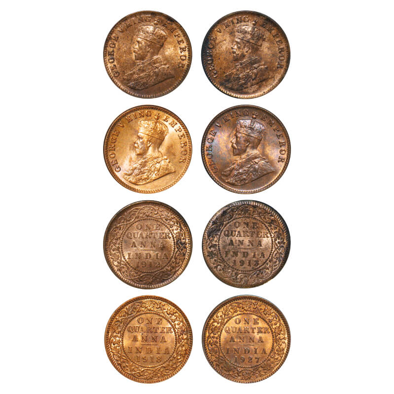 | George V, Bronze, Quarter Anna, (4 coins), 1912, 1913, 1918, 1927, Calcutta Mint, No dot, Elephant. F. Prid 658, 659, 663, 668. GK 1172, 1173, 1177, 1186. Uncirculated to Brilliant Uncirculated. Rare. |