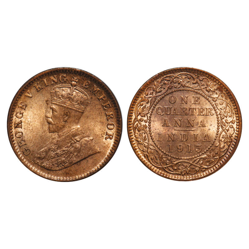 George V, Bronze, Quarter Anna, 1913, Calcutta Mint, No dot, Elephant. F. Prid 659. GK 1173. Mint State. Rare.