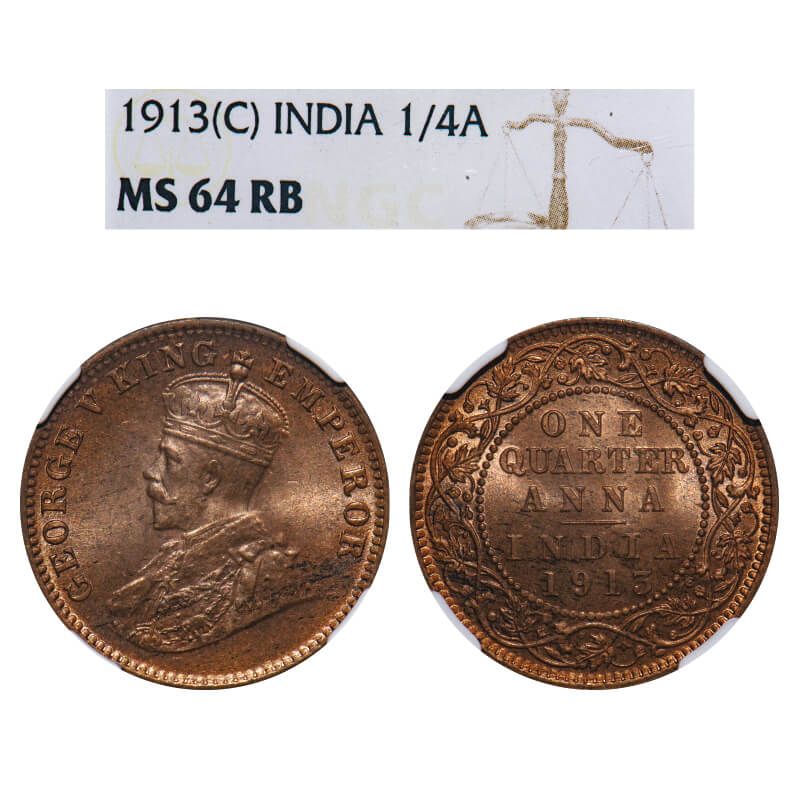 George V, Bronze, Quarter Anna, 1913, Calcutta Mint, No dot, Elephant. F. Prid 659. GK 1173. NGC Slabbed MS 64 RB. Extremely Rare.