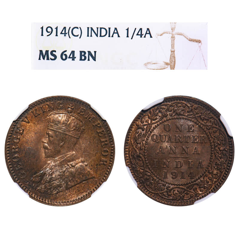 George V, Bronze, Quarter Anna, 1914, Calcutta Mint, No dot, Elephant. F. Prid 660. GK 1174. NGC Slabbed MS 64 BN. Extremely Rare.
