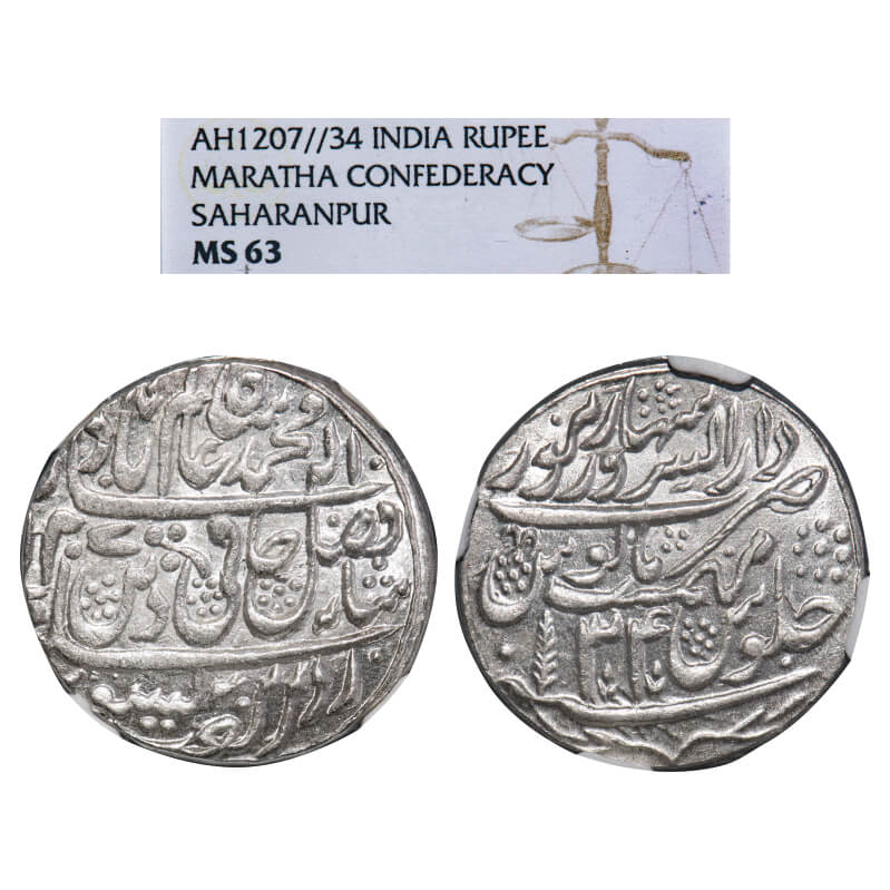 Maratha Confederacy, Silver Rupee, Dar-us-Sarur Saharanpur Mint, INO Shah Alam II, AH 1207/34 RY. M&W T1a. NGC graded MS 63, Rare.