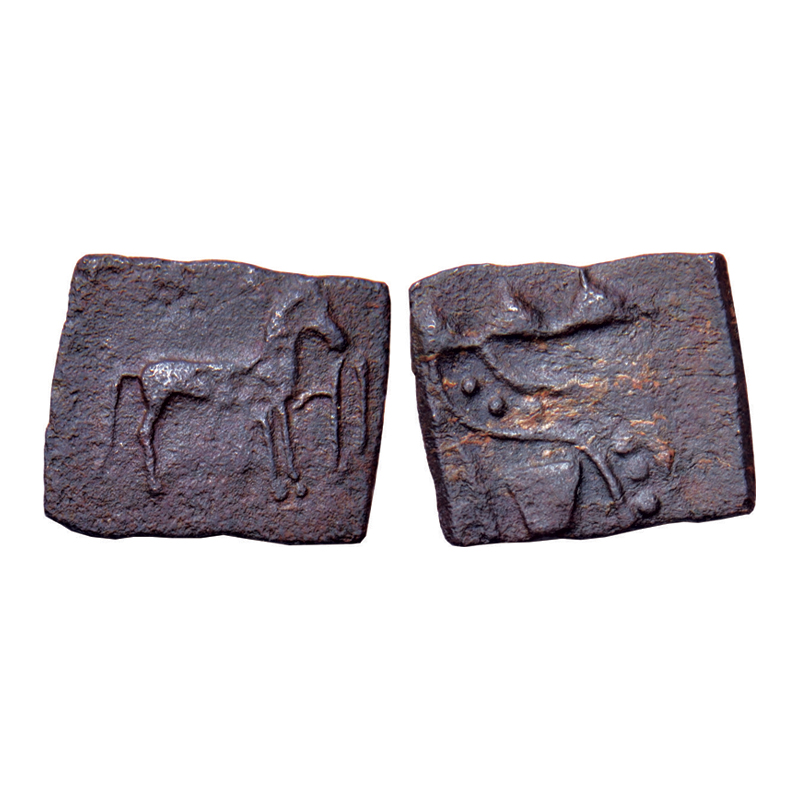 Sangam Age, Malayamans Kingdom, Copper Unit, 3.21gm, Obv: Horse standing facing right, front of goad, Rev: Three adjoining hills at the bottom, river symbol and road on left. R. Krishnamurthy Type 231.