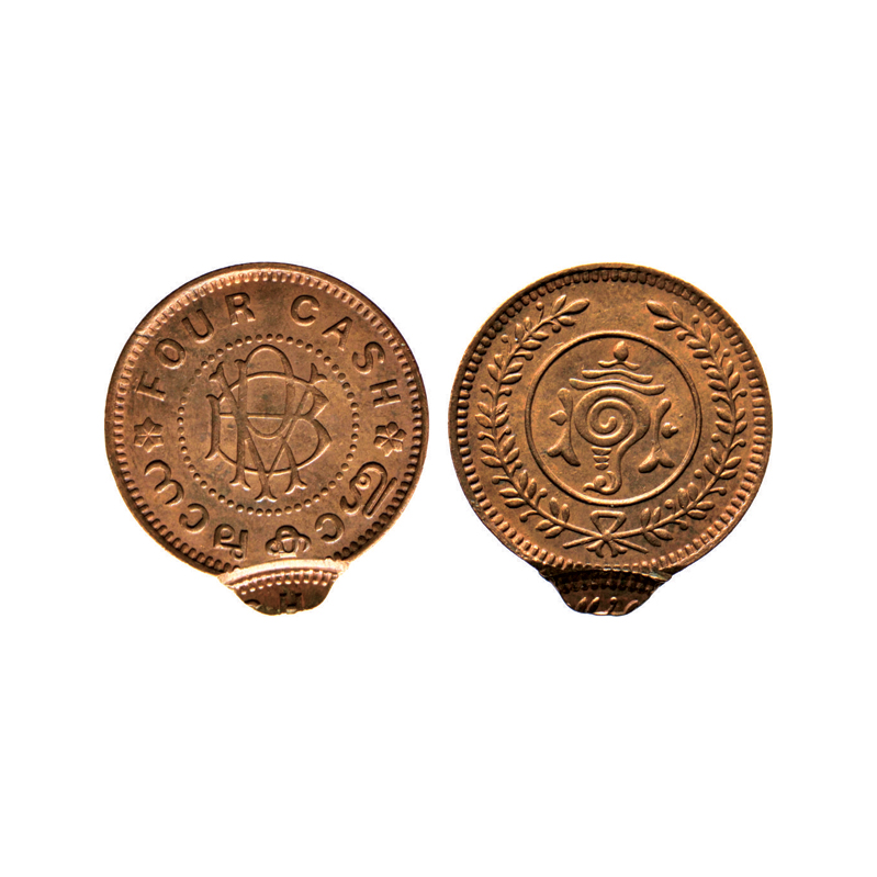 Travancore, Bronze 4 Cash, 1.93gm, Bala Rama Varma II, broad flan enlarged impression brokage/lakhi...