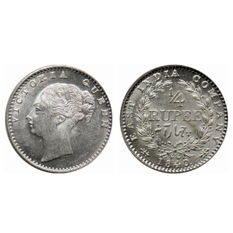 | Victoria Queen, Silver ¼ Rupee, 1840, Continuous Legend, Calcutta Mint, C/II, Indian Head, (19L + 15R Berries), Crescent raised on the top left portion of the ribbon bow of the reverse. GK 126. |
